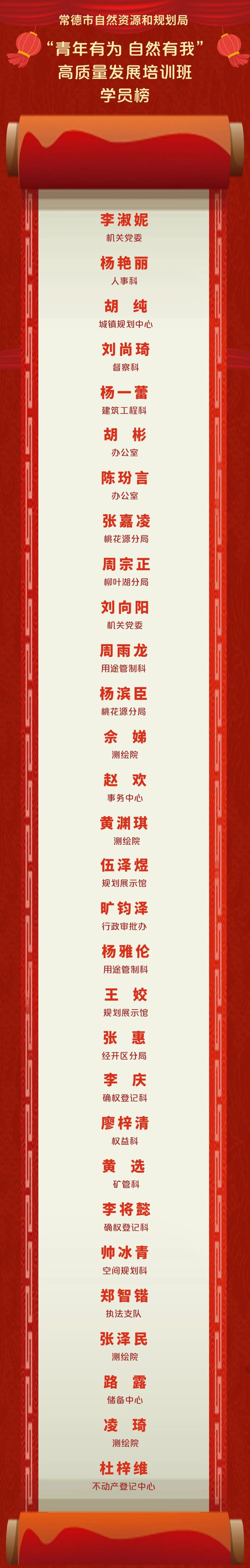 常德市自然资源和规划局“青年有为 自然有我”高质量发展培训班学员榜 来源:常德市自然资源和规划局 2024-02-02 09:30 字体:【小 大】 根据《常德市自然资源和规划局办公室关于选拔“青年有为 自然有我”高质量发展培训班学员的通知》精神,经个人报名、单位推荐、考试考核、集体研究等环节,确定李淑妮等30名同志作为“青年有为 自然有我”高质量发展培训班学员。