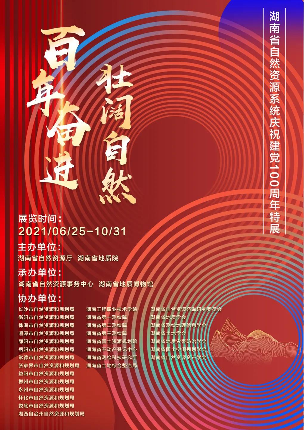 为庆祝中国共产党成立100周年,“百年奋进 壮阔自然——湖南省自然资源系统庆祝建党100周年特展”将于6月25日在湖南省地质博物馆隆重开展。