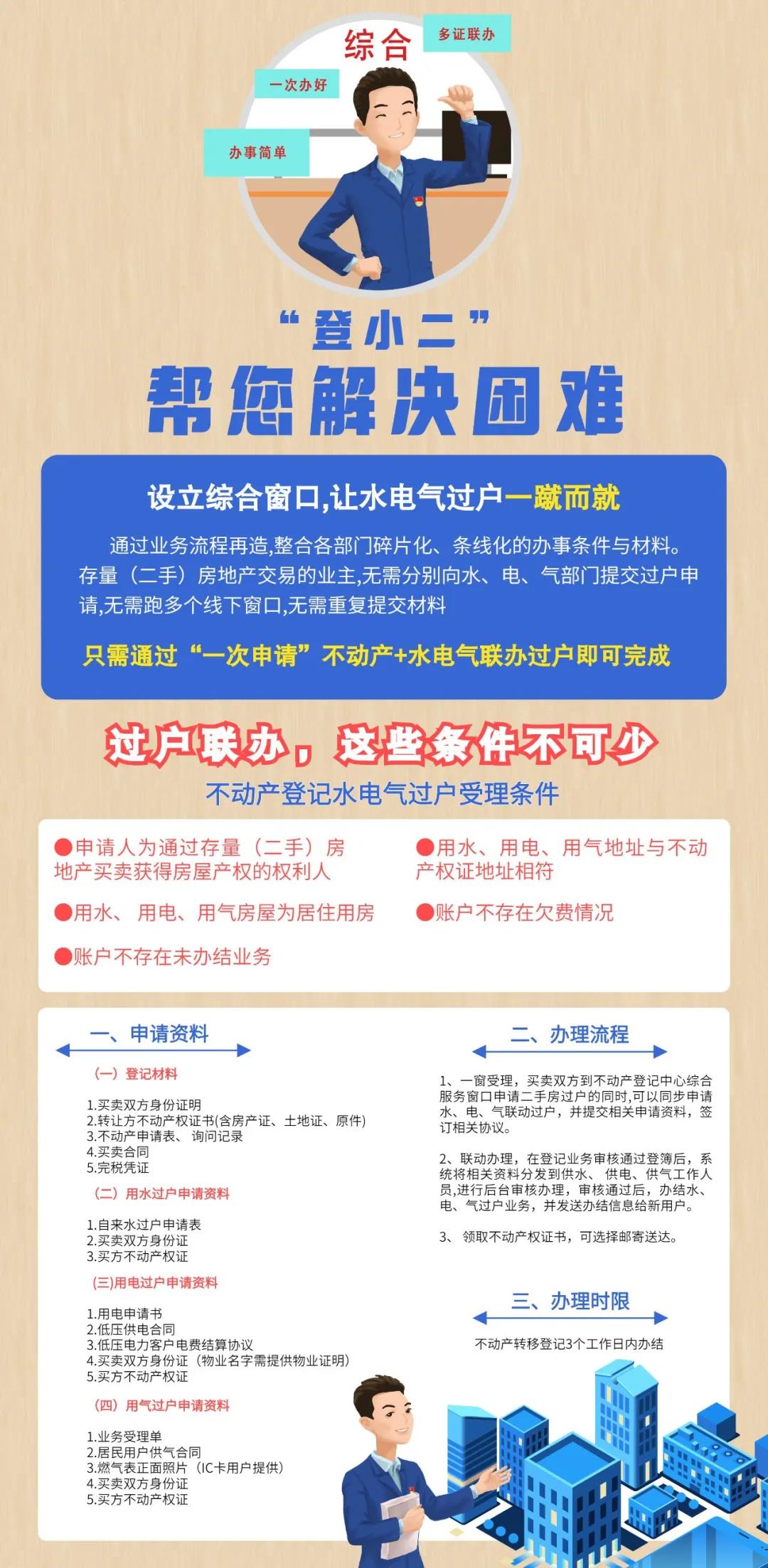 【e德登上新了】常德市江北城区二手房交易+“水电气”过户实现联动办理 来源:常德市自然资源和规划局 2021-10-29 11:37 字体:【小 大】 中国自然资源报2021年10月27日第914期推介: 湖南常德市全面推行“不动产登记+水电气”一体联办近日,湖南省常德市自然资源和规划局、常德市不动产登记中心与市自来水公司、国网常德供电公司、昆仑燃气常德分公司共同推出“不动产登记﹢水电气”一体化业务。市民办理二手房转移登记时,在4部门联办窗口统一办理不动产登记以及水电气过户手续,让市民只需跑一次、只到一个窗口、只交一套材料、只填一张表,就可以同时办理4项业务,真正让不动产登记“一窗受理、信息共享、集成服务”改革工作落到实处。