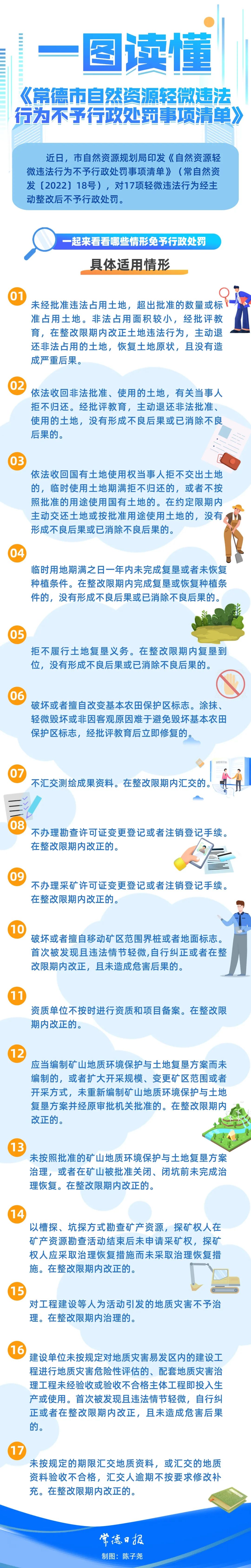 为进一步深化“放管服”改革,优化营商环境,探索建立市场主体轻微违法行为容错纠错机制,实现法律效果和社会效果的有机统一,市自然资源规划局近日印发《常德市自然资源轻微违法行为不予行政处罚事项清单》,对17类情形免予行政处罚。