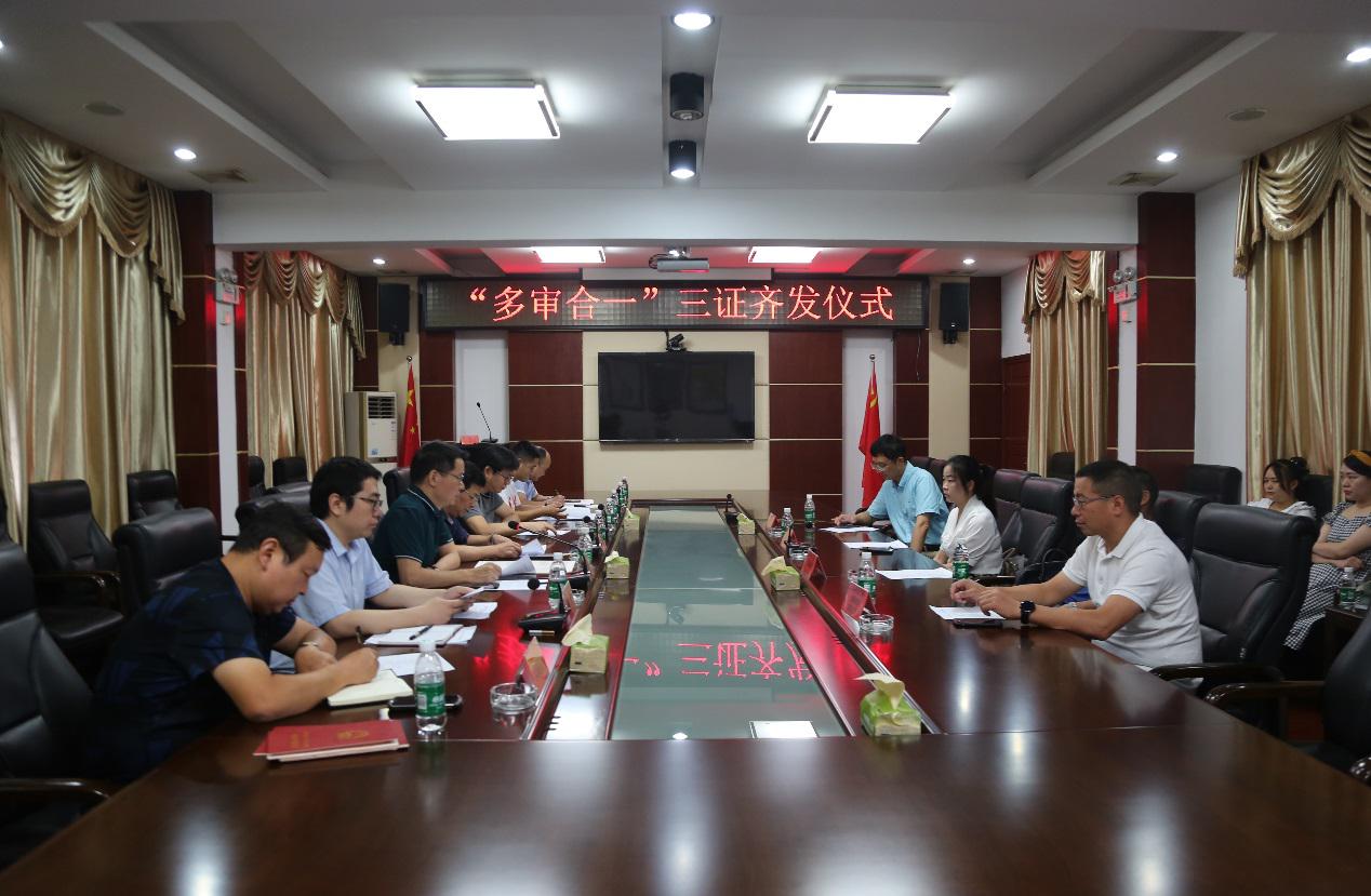 7月10日,市自然资源规划局、高新区国土分局联合举办“多审合一”“三证齐发”仪式,现场为瑞奇隆等四家企业同步发放《建设用地规划许可证》《建设工程规划许可证》《不动产权证书》。