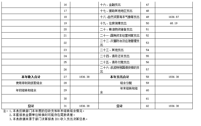 2023年度收入总计1836.38万元。与上年相比,减少152.06万元,下降7.65%,主要是因为项目拨款减少。支出总计1836.38万元。与上年相比,减少152.06万元,下降7.65%,主要原因是项目支出减少。